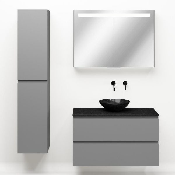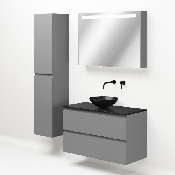 Greeploos badkamermeubel in de kleur licht grijs mat is 100 cm breed. Op het meubel ligt een afdekplaat met een gelamineerde toplaag of volledig gemaakt van natuursteen.