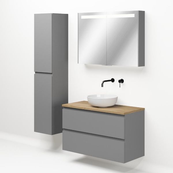 Greeploos badkamermeubel in de kleur licht grijs mat is 100 cm breed. Op het meubel ligt een afdekplaat met een gelamineerde toplaag of volledig gemaakt van natuursteen.