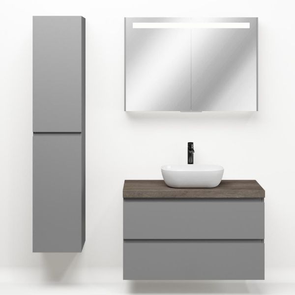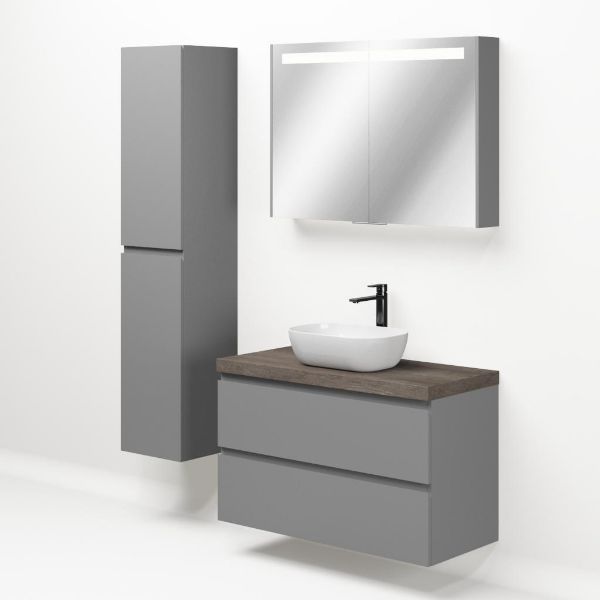 Greeploos badkamermeubel in de kleur licht grijs mat is 100 cm breed. Op het meubel ligt een afdekplaat met een gelamineerde toplaag of volledig gemaakt van natuursteen.
