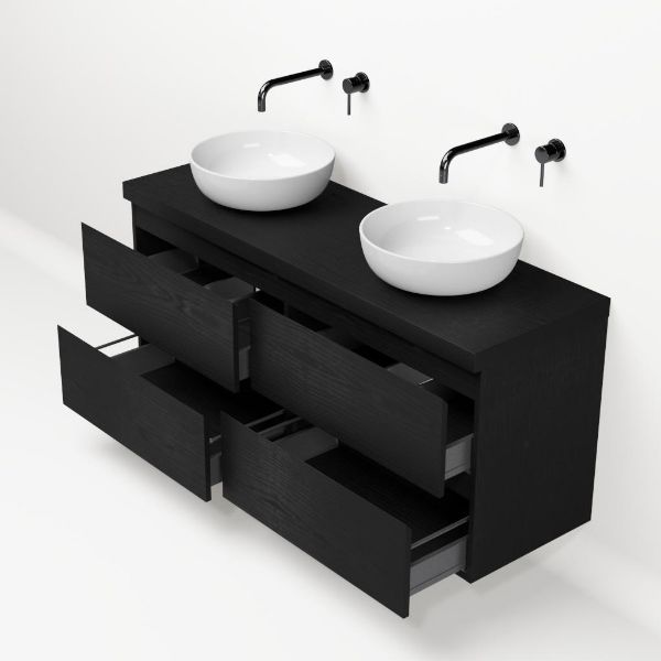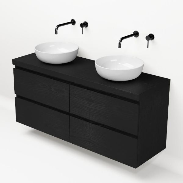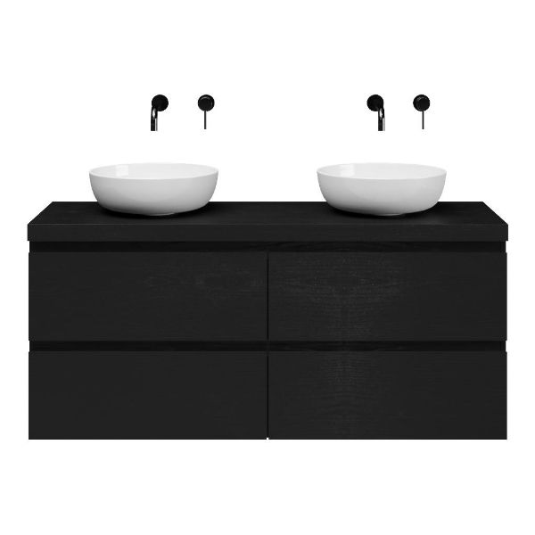Greeploos badkamermeubel in de kleur zwart mat eiken is 140 cm breed. Op het meubel ligt een afdekplaat met een gelamineerde toplaag of volledig gemaakt van natuursteen.