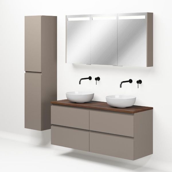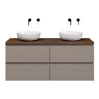 Greeploos badkamermeubel in de kleur taupe is 140 cm breed. Op het meubel ligt een afdekplaat met een gelamineerde toplaag of volledig gemaakt van natuursteen.
