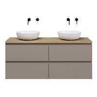 Greeploos badkamermeubel in de kleur taupe is 140 cm breed. Op het meubel ligt een afdekplaat met een gelamineerde toplaag of volledig gemaakt van natuursteen.