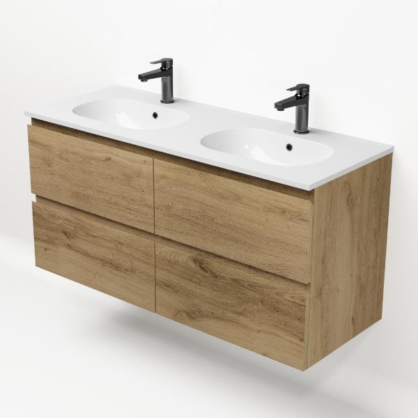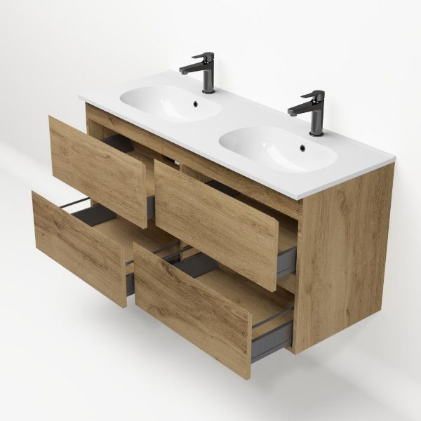 Bellanti Gisella/Como badmeubel 120x46 4 softclose laden warm eiken greeploos keramische wastafel dubbel wit met 2 kraangaten