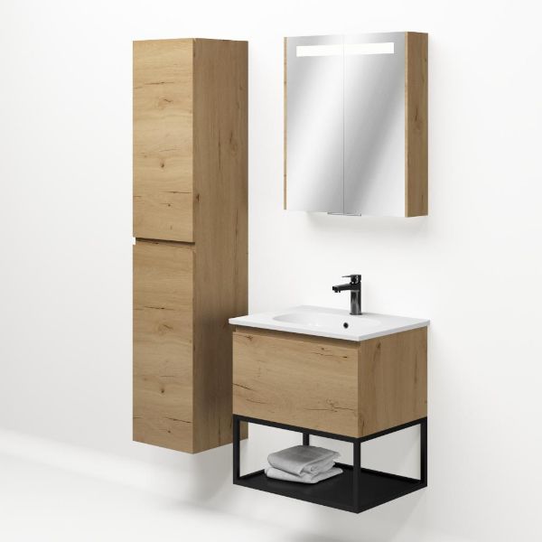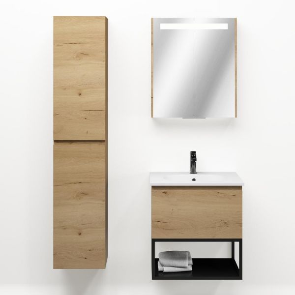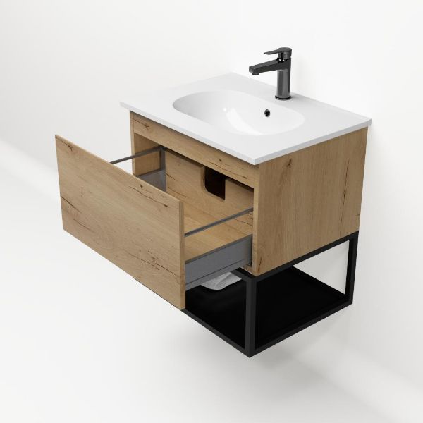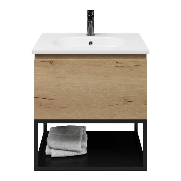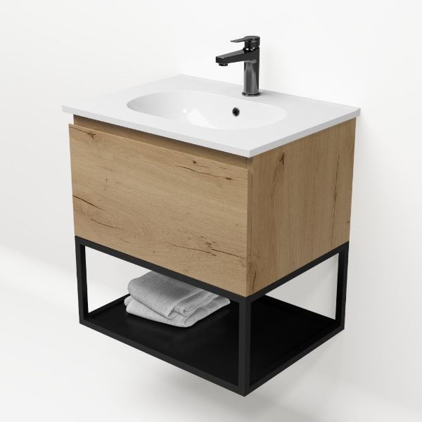 | | Bellanti Solo/Tela/Como badmeubel 60x46 1 softclose lade eiken natuur greeploos keramische wastafel wit met 1 kraangat met mat zwart metalen frame |