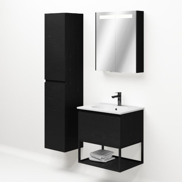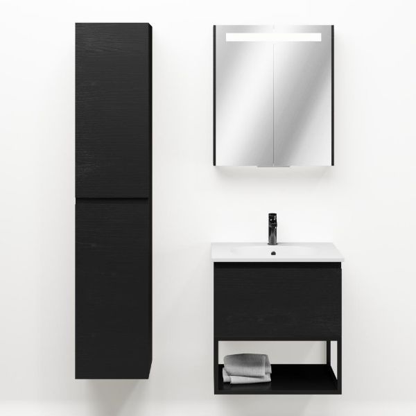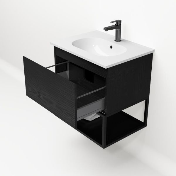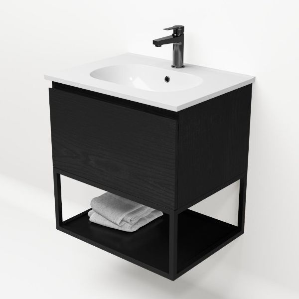 | | Bellanti Solo/Tela/Como badmeubel 60x46 1 softclose lade mat zwart eiken greeploos keramische wastafel wit met 1 kraangat met mat zwart metalen frame |