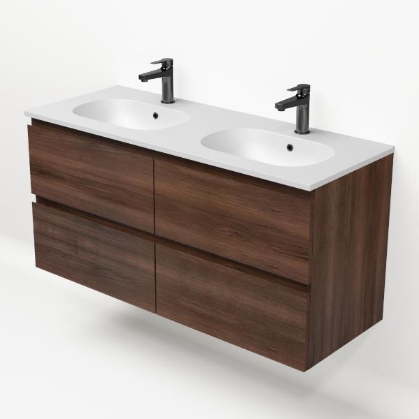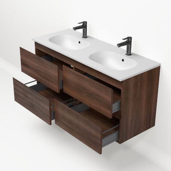 Bellanti Gisella/Como badmeubel 120x46 4 softclose laden walnoot greeploos keramische wastafel dubbel mat wit met 2 kraangaten