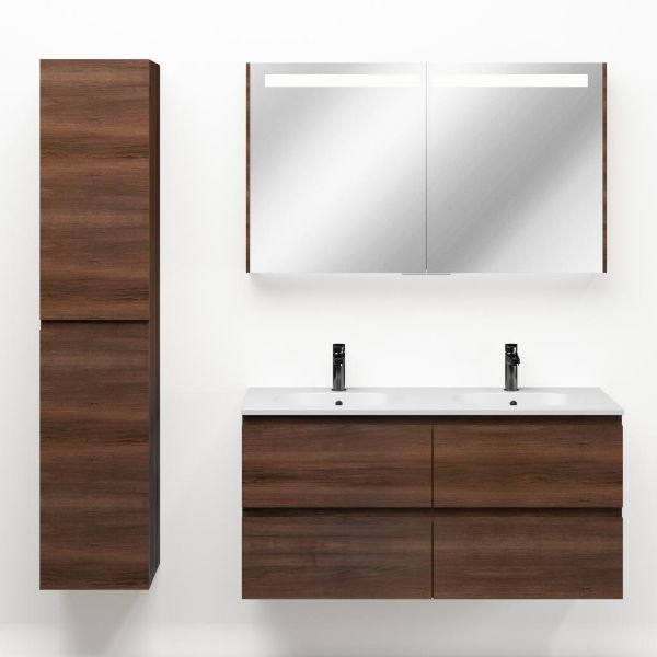 Greeploos badkamermeubel in de kleur walnoot is 120 cm breed.  De wastafel is vervaardig in keramiek en heeft de kleur wit mat. Dit badkamermeubel met deze wastafel is leverbaar tussen de 60 cm t/m 120 cm