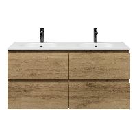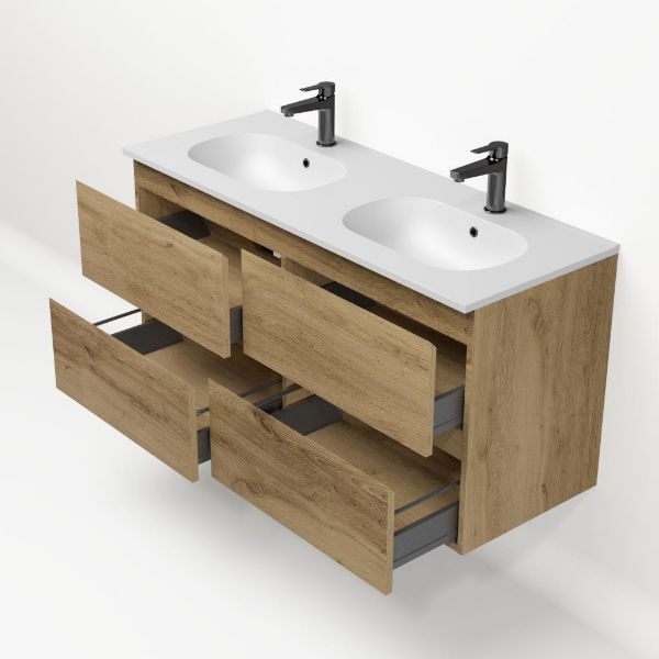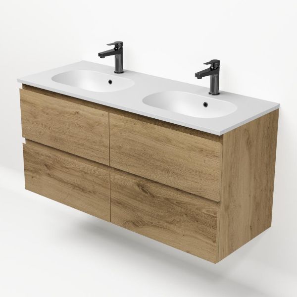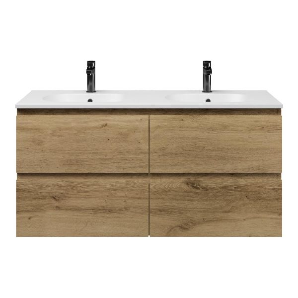 Bellanti Gisella/Como badmeubel 120x46 4 softclose laden warm eiken greeploos keramische wastafel dubbel mat wit met 2 kraangaten
