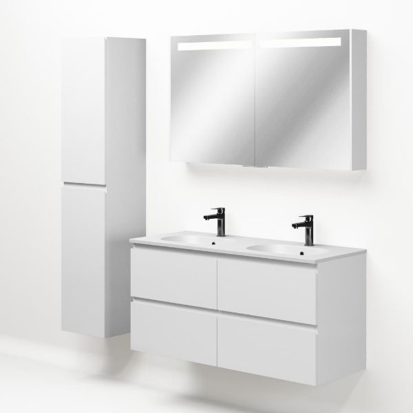 Greeploos badkamermeubel in de kleur wit hoogglans is 120 cm breed.  De wastafel is vervaardig in keramiek en heeft de kleur wit mat. Dit badkamermeubel met deze wastafel is leverbaar tussen de 60 cm t/m 120 cm