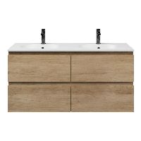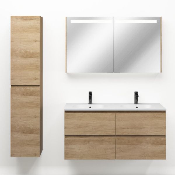 Greeploos badkamermeubel in de kleur olm is 120 cm breed.  De wastafel is vervaardig in keramiek en heeft de kleur wit mat keramiek. Dit badkamermeubel met deze wastafel is leverbaar tussen de 60 cm t/m 120 cm