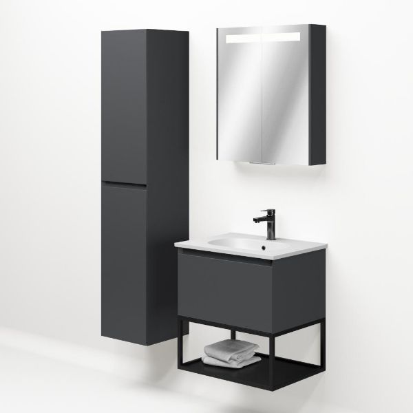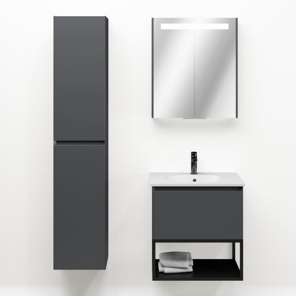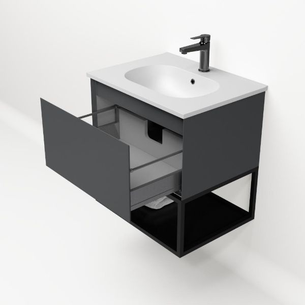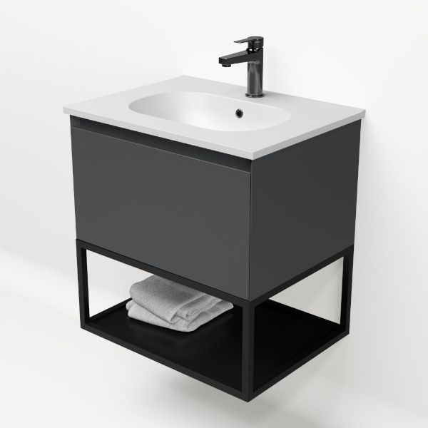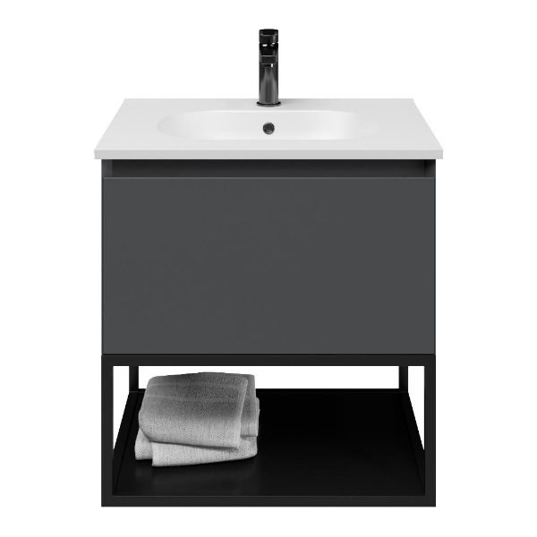 | | Bellanti Solo/Tela/Como badmeubel 60x46 1 softclose lade antraciet mat greeploos keramische wastafel mat wit met 1 kraangat met mat zwart metalen frame |