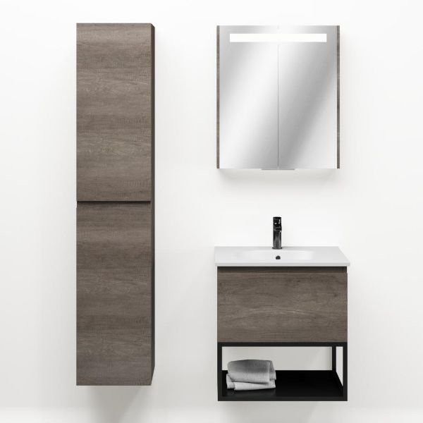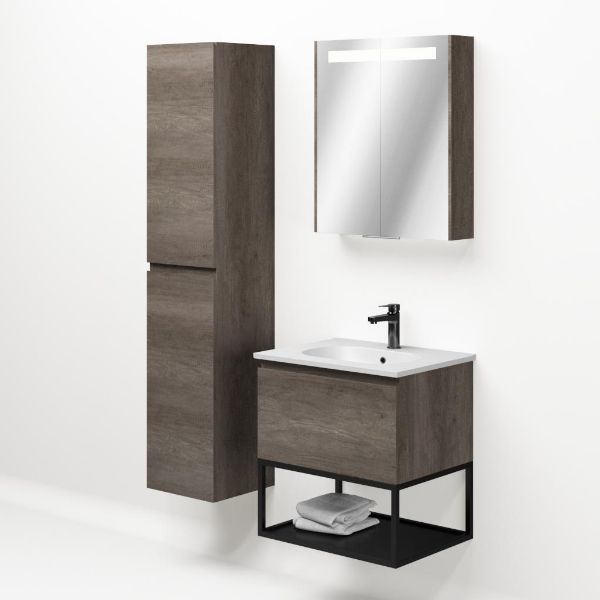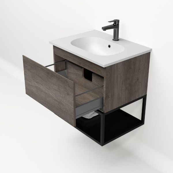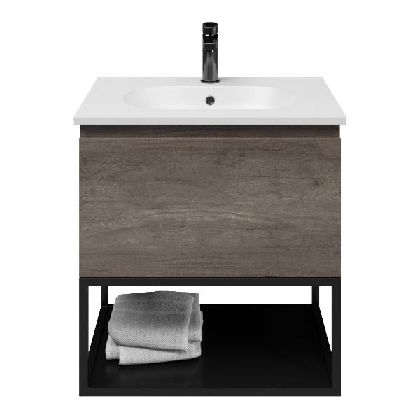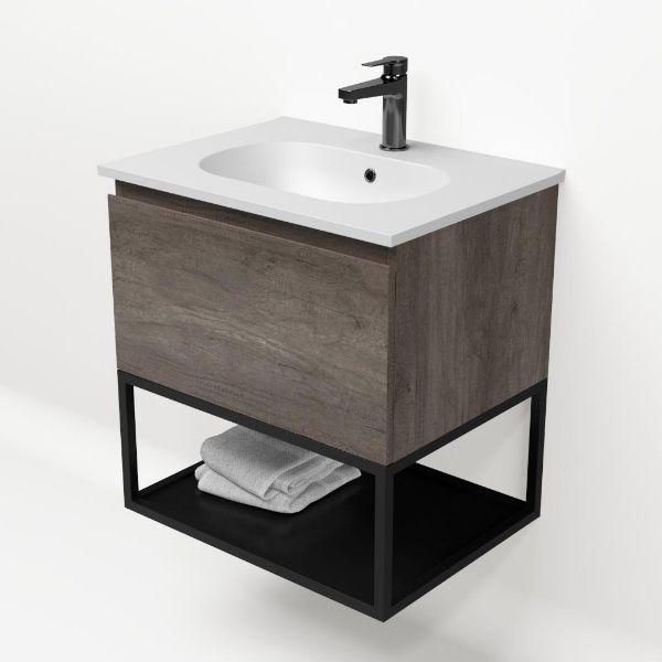 | | Bellanti Solo/Tela/Como badmeubel 60x46 1 softclose lade olm donker grijs greeploos keramische wastafel mat wit met 1 kraangat met mat zwart metalen frame |