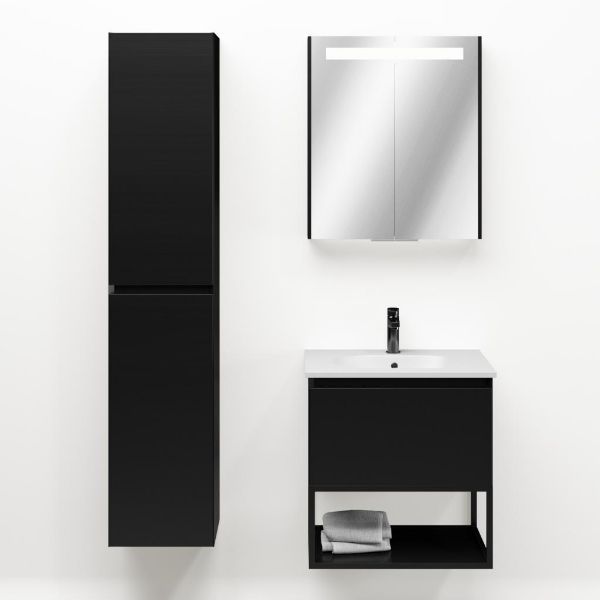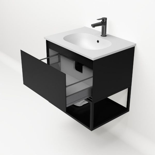 | | Bellanti Solo/Tela/Como badmeubel 60x46 1 softclose lade zwart mat greeploos keramische wastafel mat wit met 1 kraangat met mat zwart metalen frame |