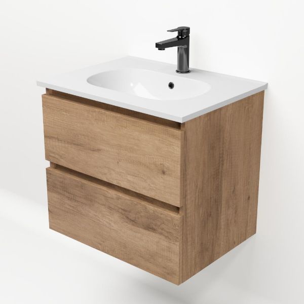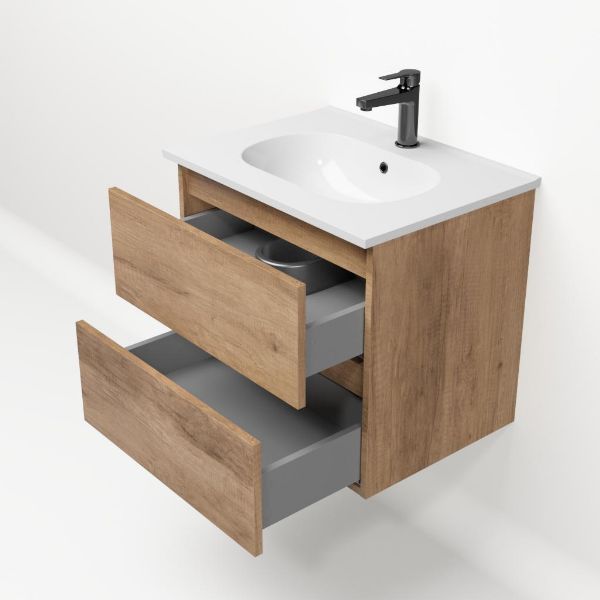 | | TrisLine Gia/Como badmeubel 60x46 2 softclose laden sevilla eiken greeploos keramische wastafel wit met 1 kraangat |
