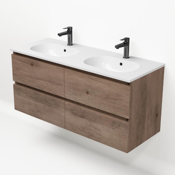 | | TrisLine Gia/Como badmeubel 120x46 4 softclose laden allicante eiken greeploos keramische wastafel dubbel wit met 2 kraangaten |