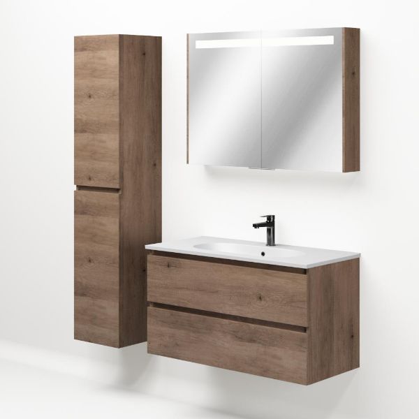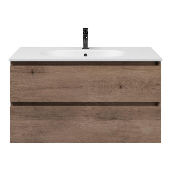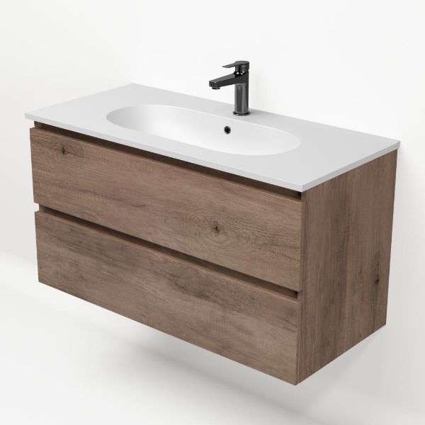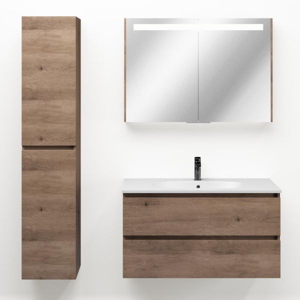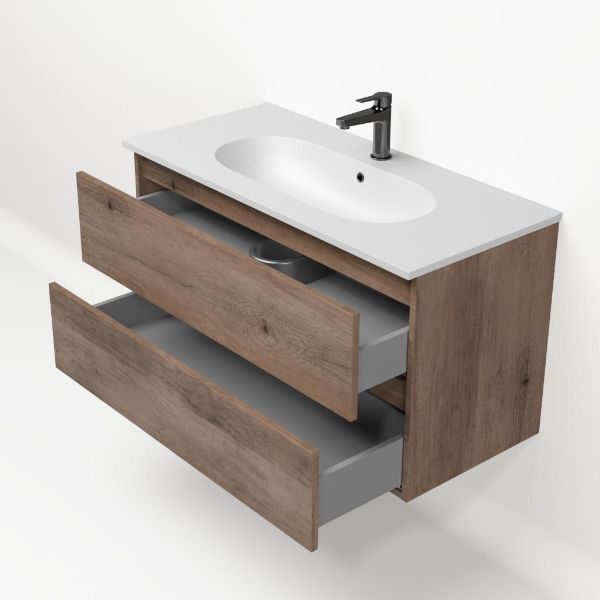 | | TrisLine Gia/Como badmeubel 100x46 2 softclose laden allicante eiken greeploos keramische wastafel mat wit met 1 kraangat |