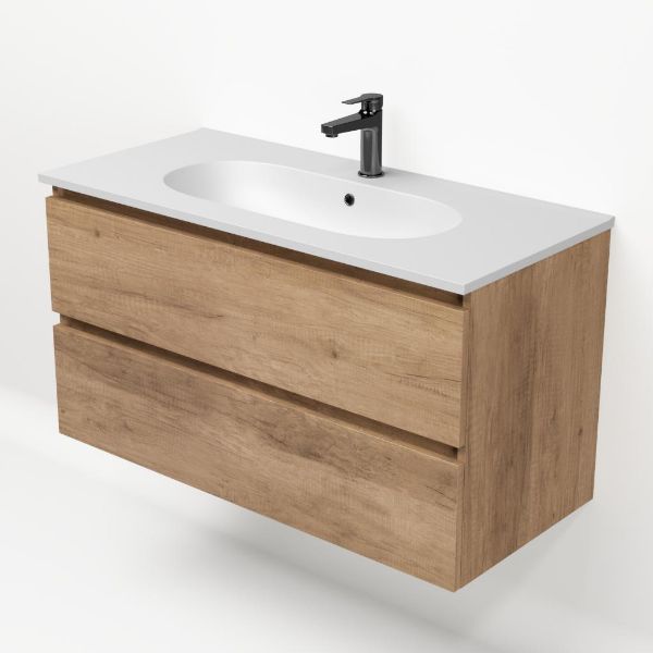 | TrisLine Gia/Como badmeubel 100x46 2 softclose laden sevilla eiken greeploos keramische wastafel mat wit met 1 kraangat |