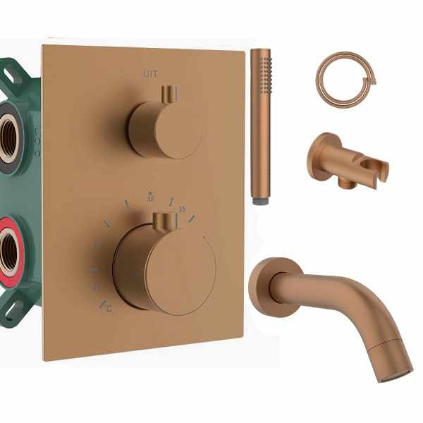 | | Wolfsburg Ivan inbouw BADKRAAN set geborsteld koper met thermostatisch inbouwdeel met baduitloop en handdouche naar keuze |
